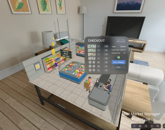 Hey everyone! I’ve been tinkering on a small project for Apple Vision Pro and wanted to share some screenshots. It’s a cozy little store-management sim where you: