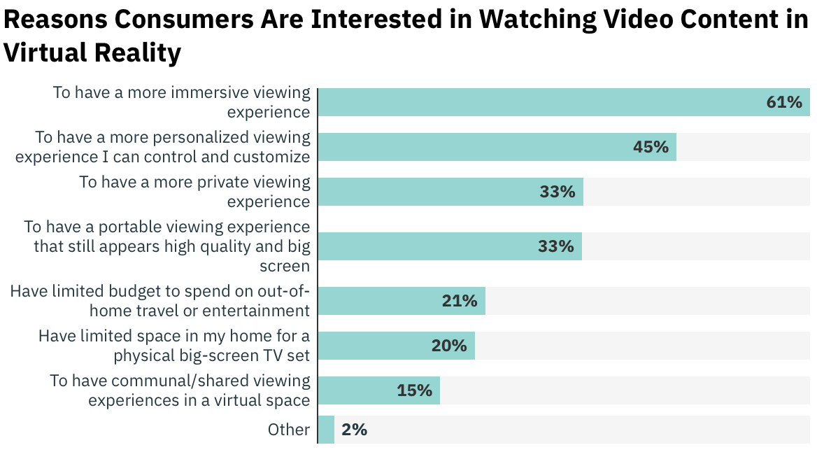 Mixed reality headsets such as Vision Pro offer some compelling reasons to use them to consume video content. Among those who said they would be interested in watching video via headset, consumers cited the benefits of having a more immersive (61%), personalized (45%), portable and high-quality (33%) or private (33%) viewing experience.