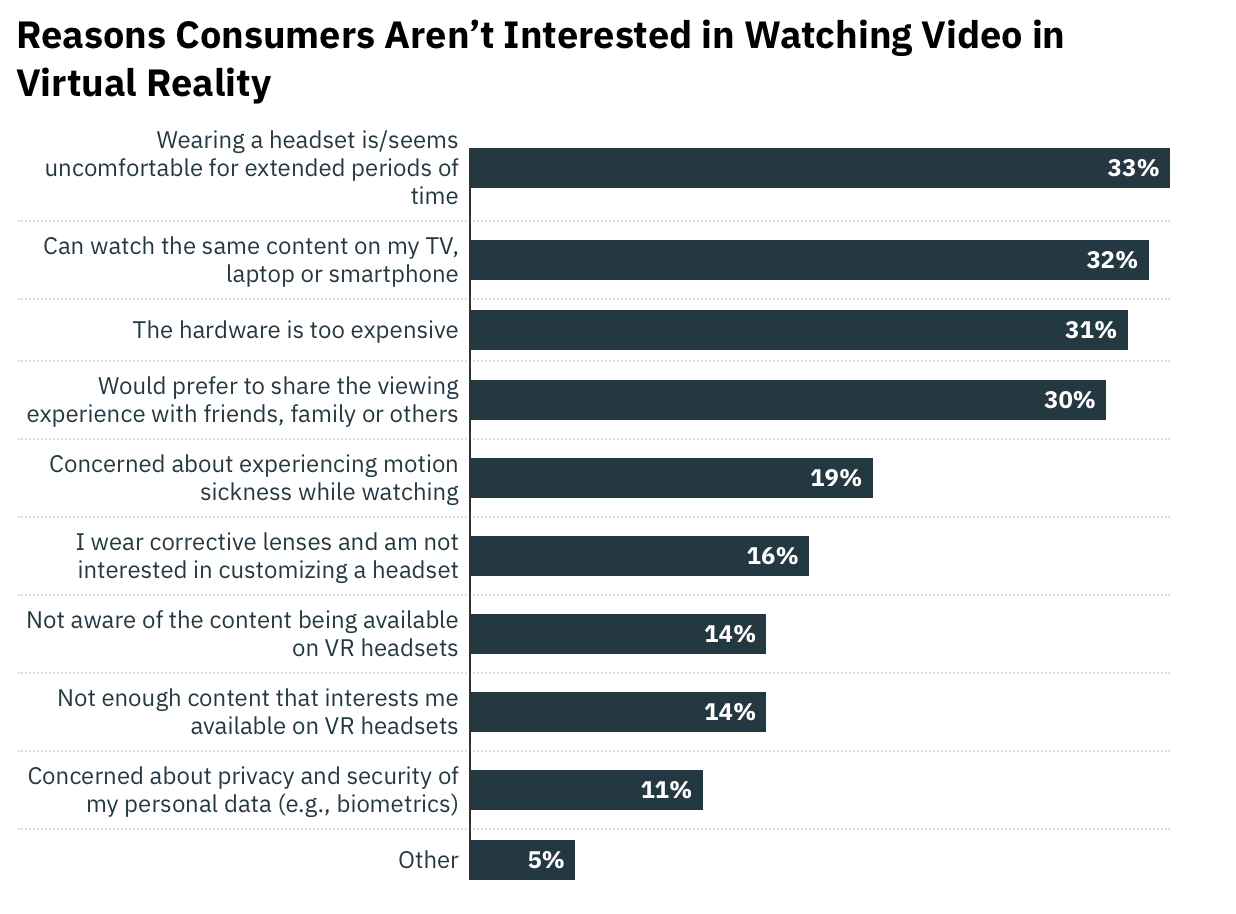 Still, hurdles remain. Among the 53% of respondents who said they weren’t interested in watching video content on Vision Pro, the biggest deterrents were discomfort (33%), redundancy with other screened devices (32%) and the cost of the hardware (31%).